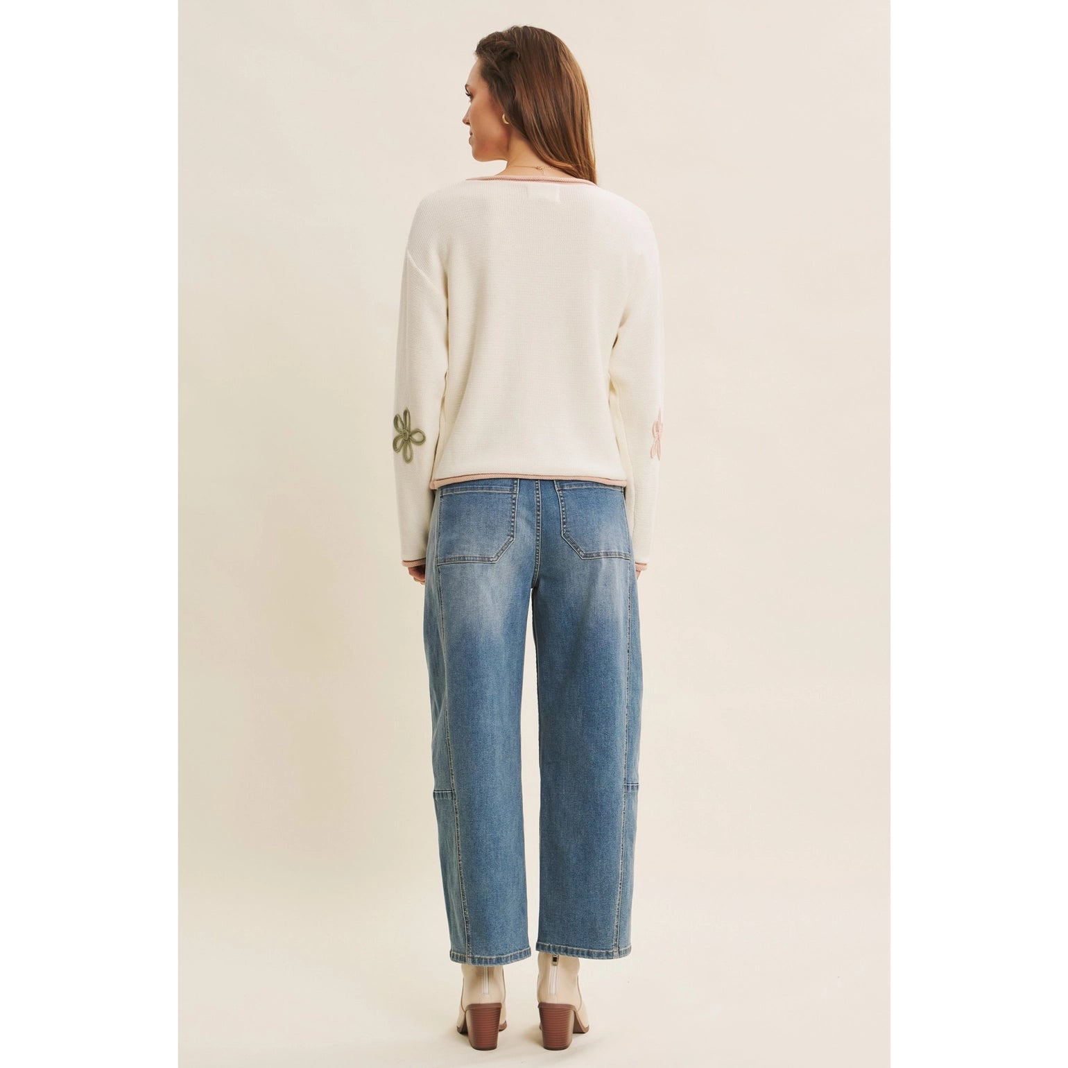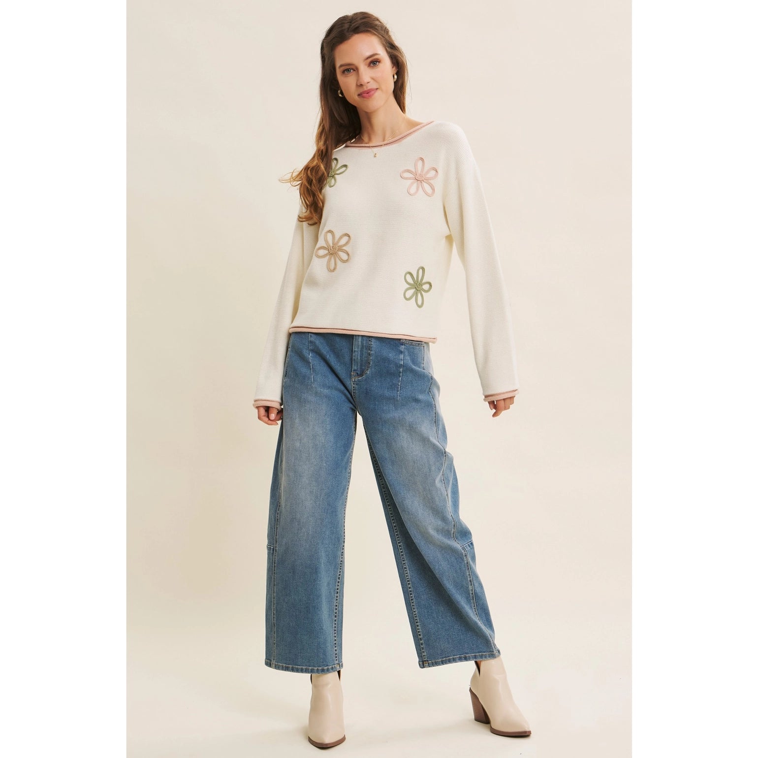 Elevate your wardrobe with this exquisitely crafted floral applique soft sweater. Featuring a round neck and contrast neck detail, its oversized fit drapes elegantly for effortless sophistication. The sweater knit fabric offers a gentle softness, while the contrast floral applique adds a refined decorative touch. Long sleeves complete this timeless piece, perfect for a polished yet comfortable look.