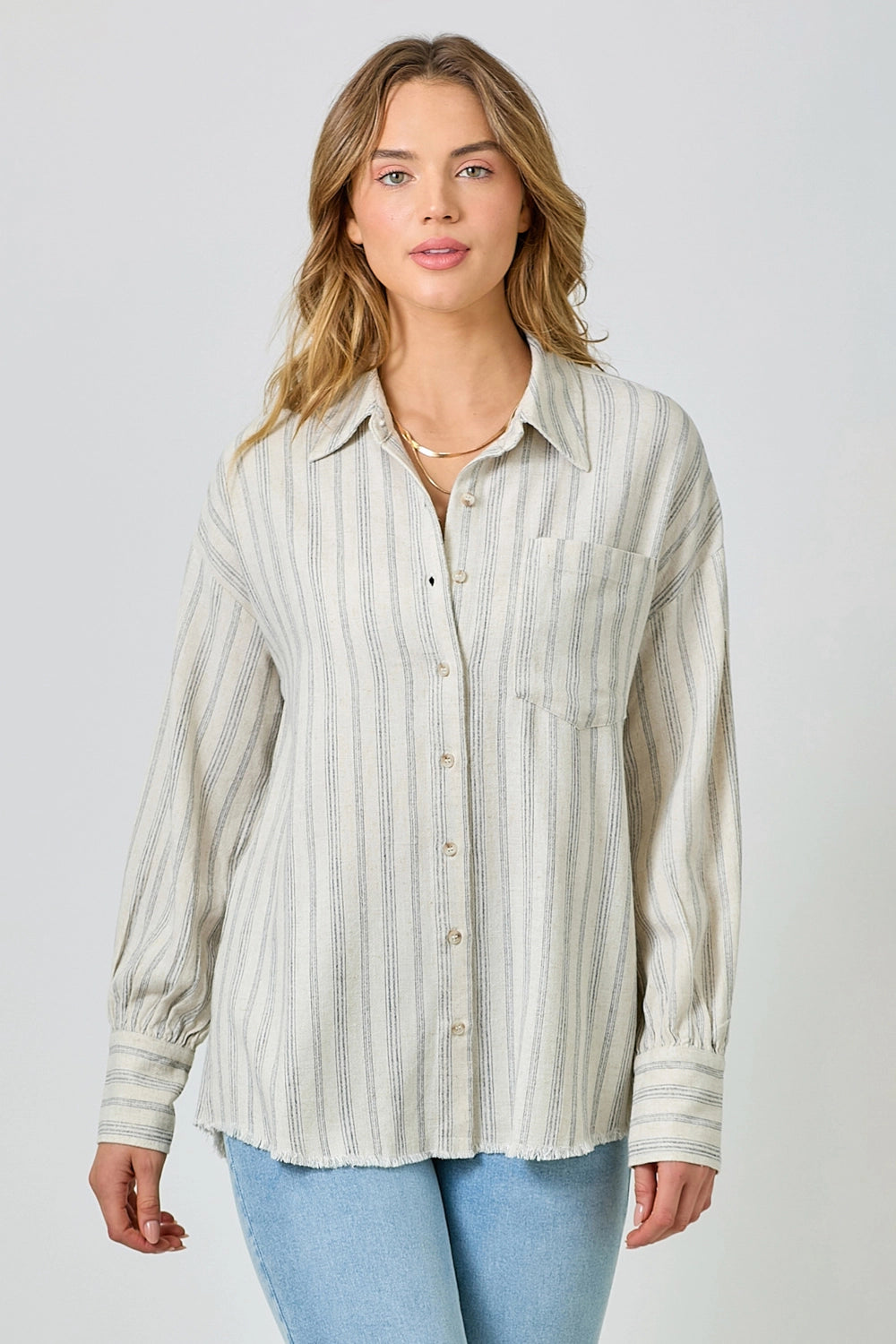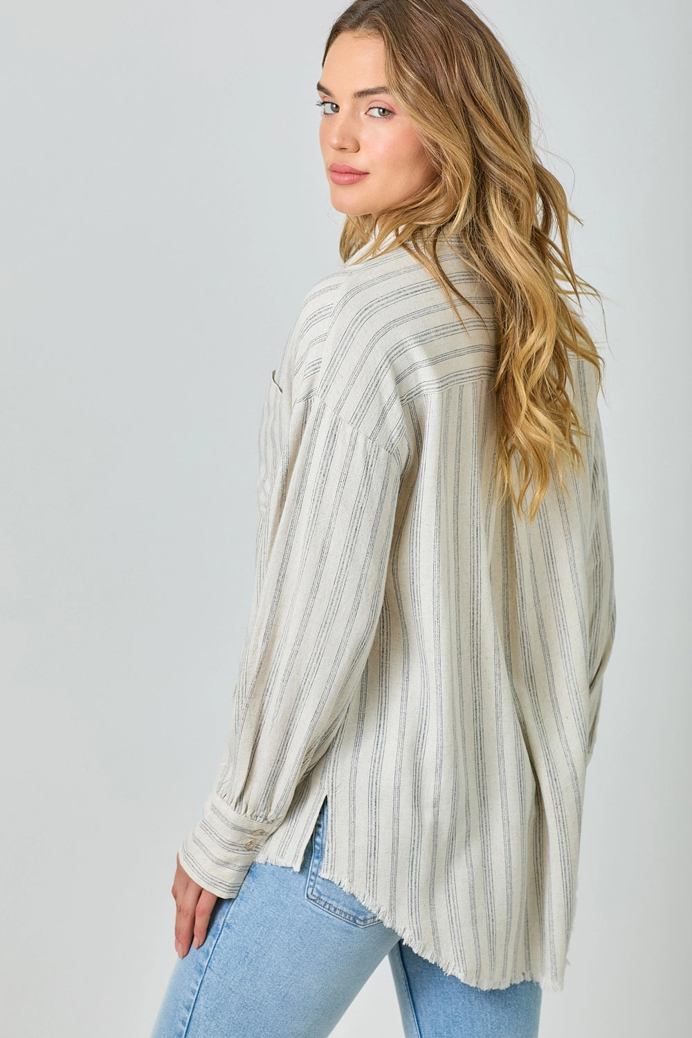 Get ready to add some flair to your wardrobe with our Frayed Fringe Edge Oversized Button Up Shirt! Featuring a bust pocket, hi-lo hem, and stylish side slits, this trendy shirt showcases a playful stripe pattern. Perfect for adding a touch of quirkiness to any outfit.