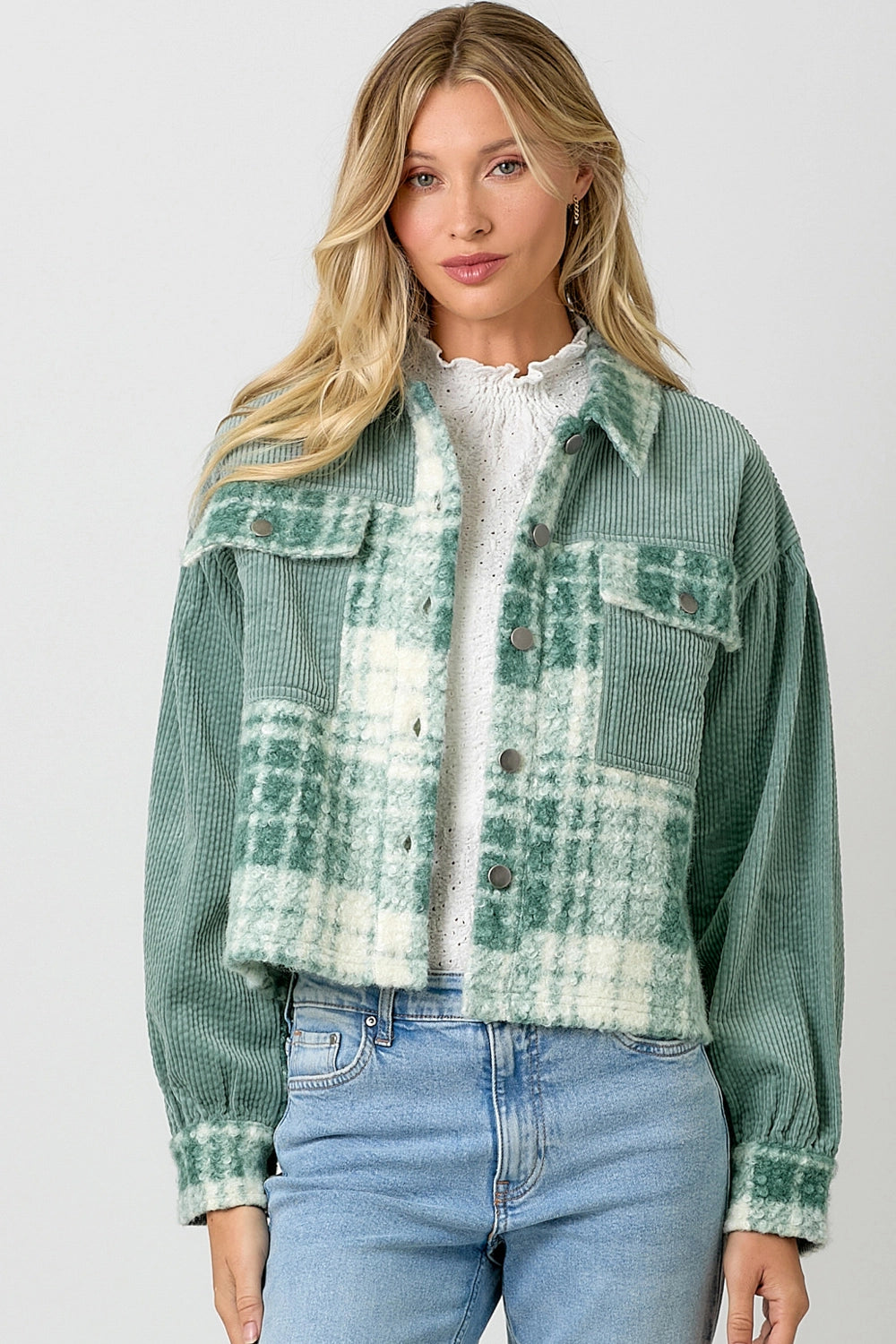Elevate your outerwear with this sophisticated Mixed Media Shacket, featuring a classic button-down design complemented by bust pockets for subtle functionality. The plaid print faux fur adds rich texture, while the bubble sleeves and corduroy details bring refined dimension and warmth. Perfect for layering, this shacket combines comfort with distinctive style for a polished, modern look.