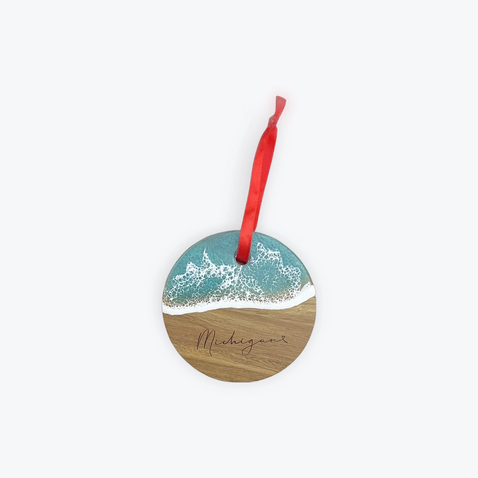 4X4in wooden circle ornament- made to capture the beauty of lake shores of Michigan. Made with epoxy/resin