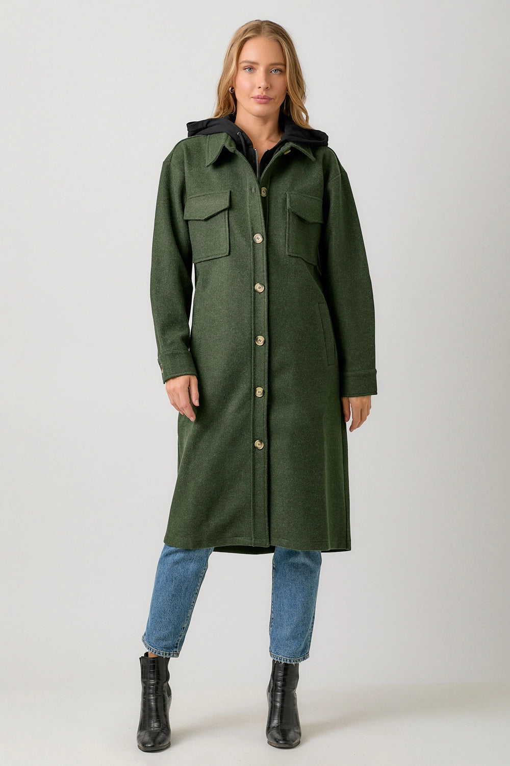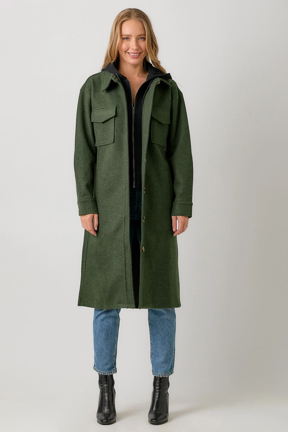 The Twofer Hoodie Solid Coat merges practicality with refined style through a dual-layer design. Featuring an attached hoodie with a sleek zipper closure for a streamlined look, it is complemented by a button-down outer layer that adds structure. Thoughtfully designed bust and side pockets provide discreet storage, while the knee-length cut offers elegant coverage ideal for sophisticated layering. This coat is perfect for those seeking a versatile piece that balances comfort and polished appeal.