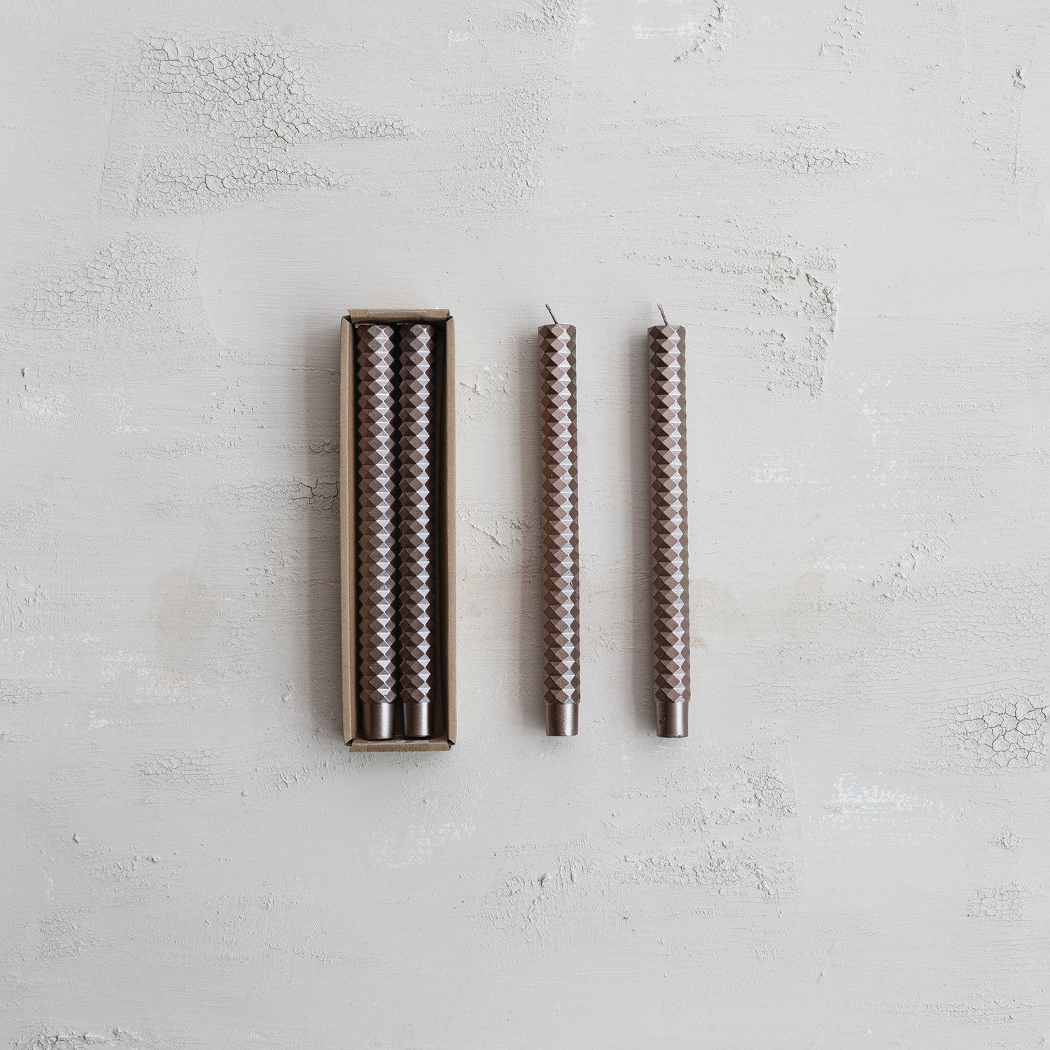 10"H Unscented Faceted Taper Candles in Box, Champagne Color, Set of 2 (Est. Burn Time 9 Hours)